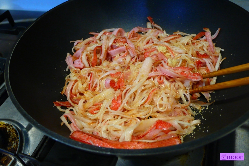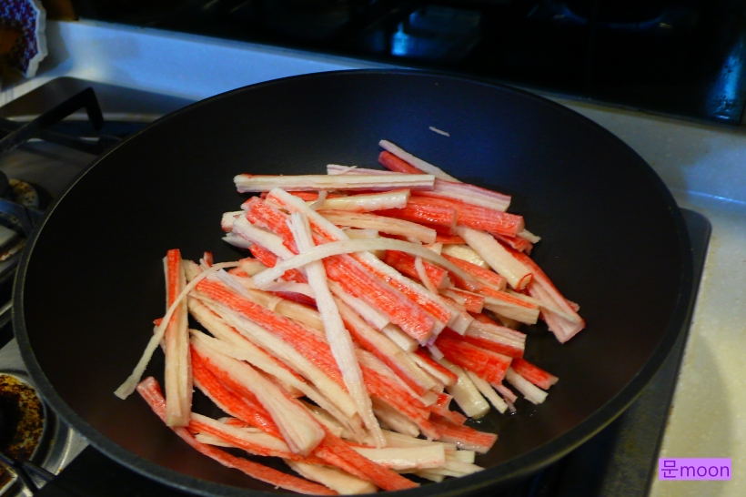 웍에 카놀라유를 두르고 맛살을 넣어 볶아줍니다.