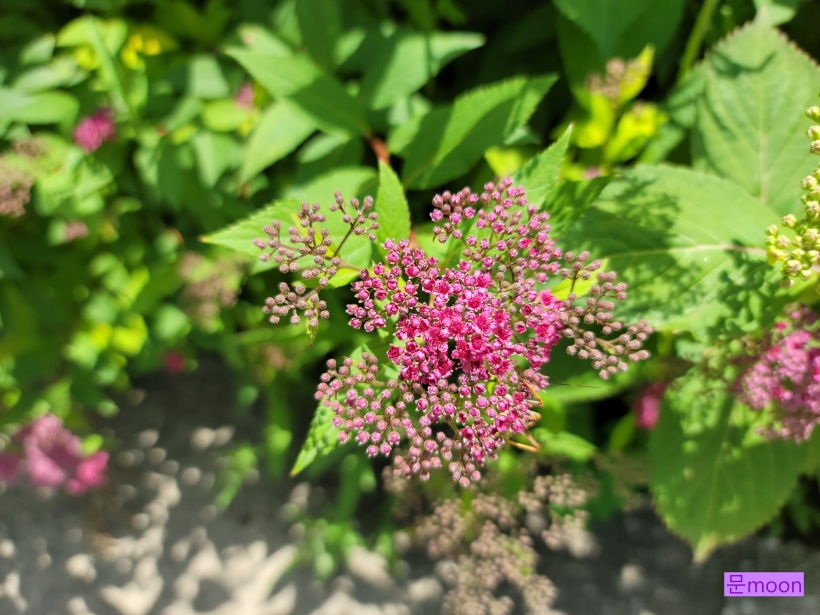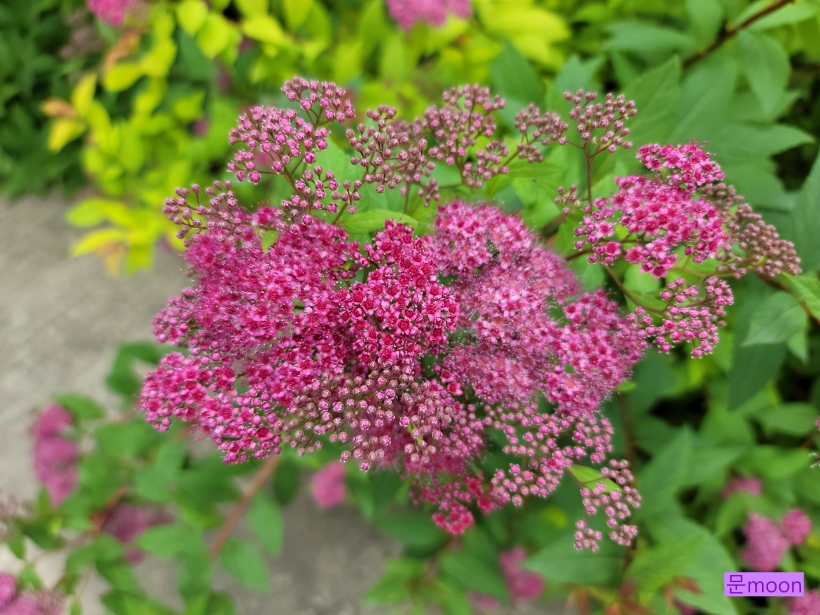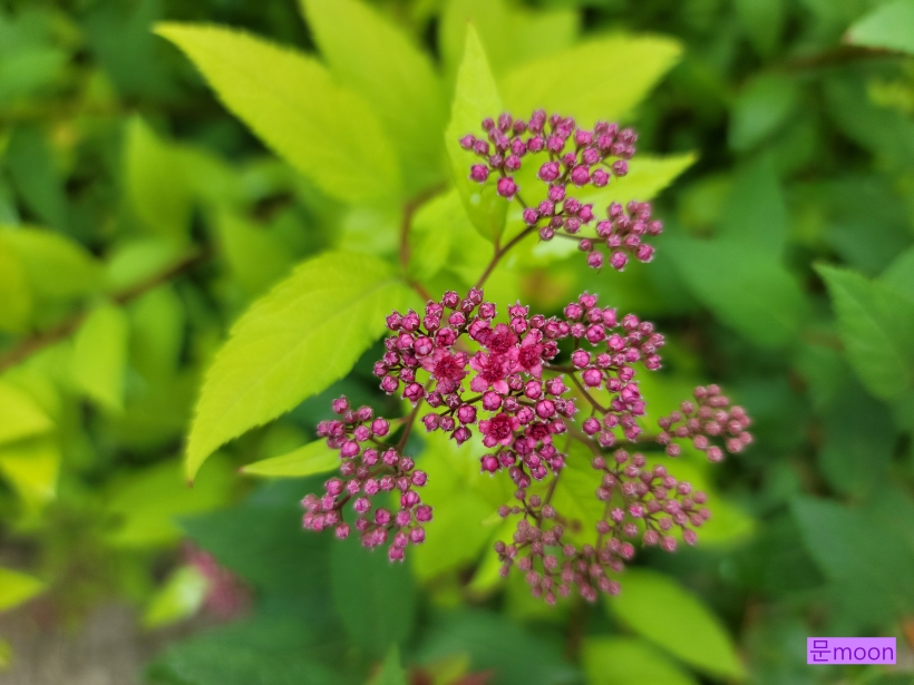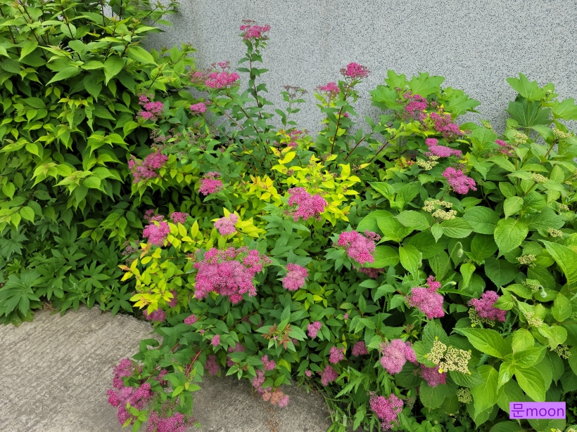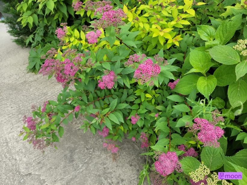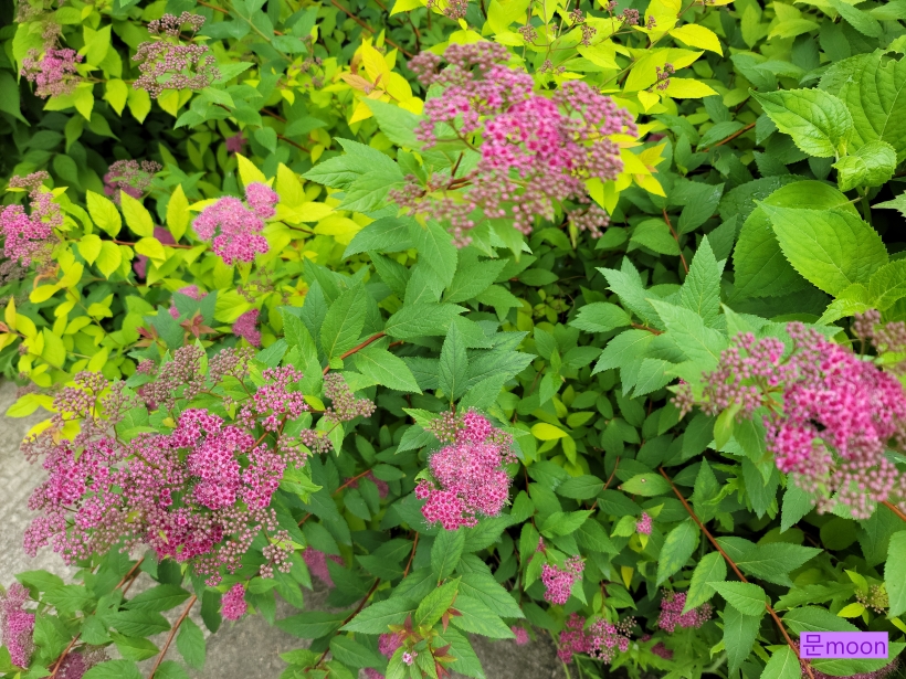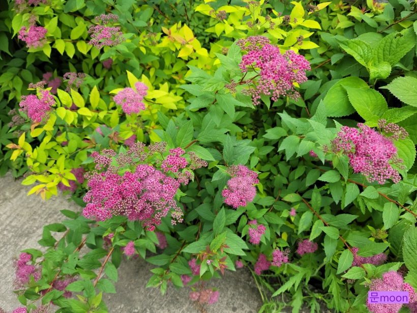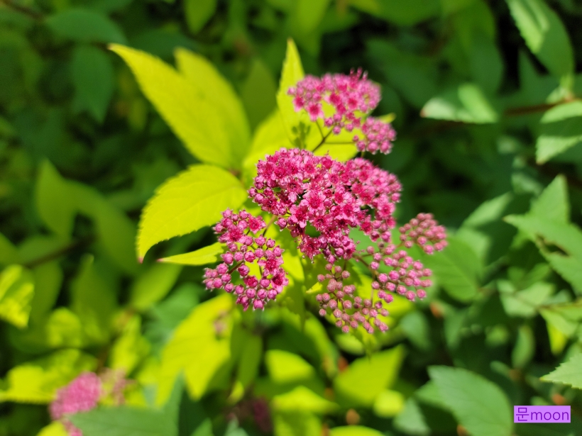 조팝나무가 종류가 많은데 이 황금조팝은 꽃은 분홍조팝 처럼 분홍색 이지만 잎이 황금색이라