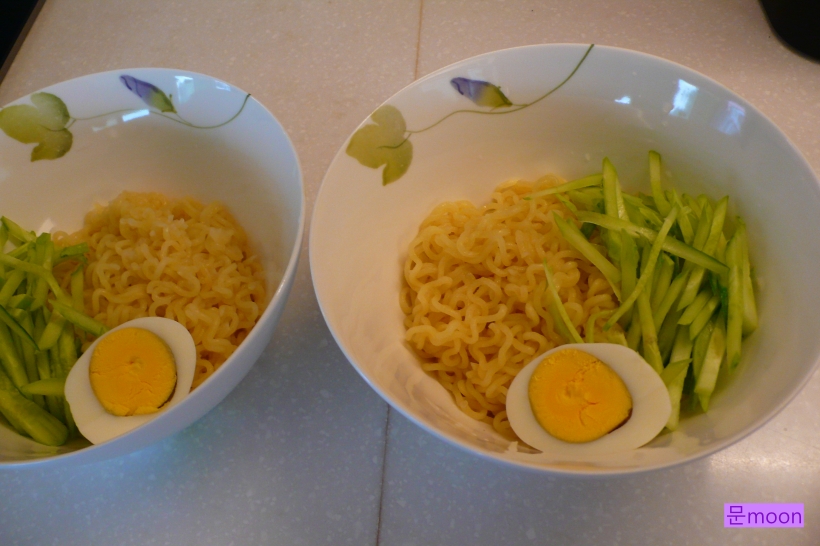 재료 : 라면2봉지, 오이1개, 삶은계란1개, 얼음, 물