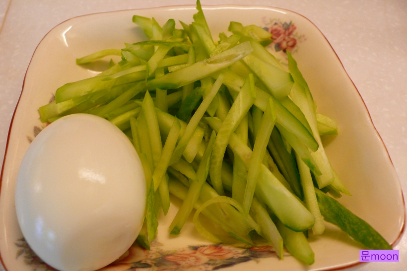 텃밭오이 한개 따서 채썰어놓고 삶은계란도 준비하구요..