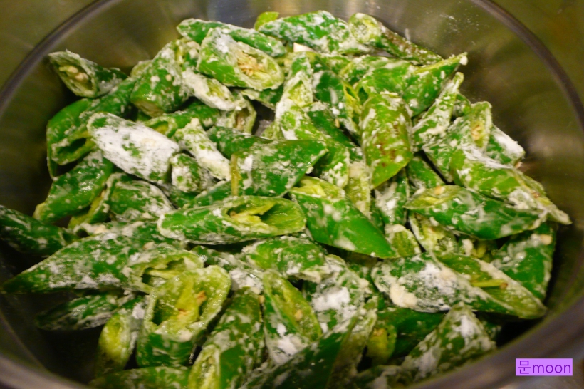 물기 뺀 고추를 스텐볼에 담고 소금1/2작은술, 튀김가루2큰술을 넣어 고루 묻혀줍니다.