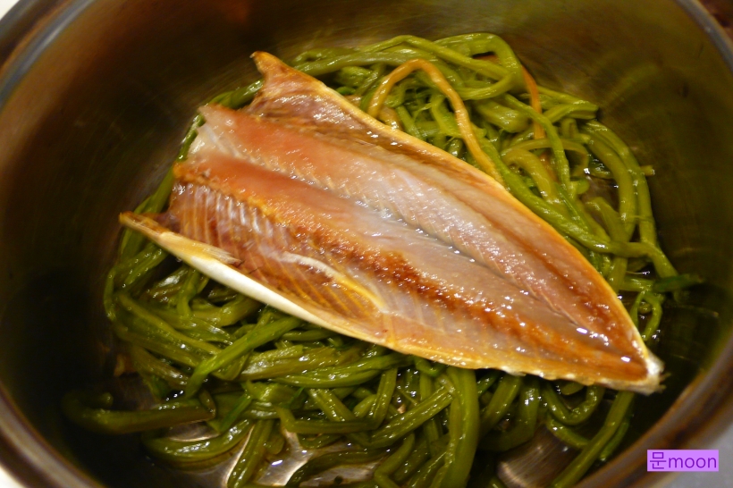 냄비에 고구마줄기를 깔고 고등어를 얹습니다.