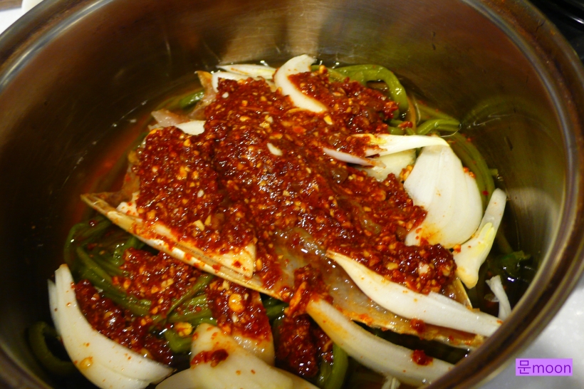 양파를 올리고 양념장을 얹고 물을 잘박하게 담기게 넣고 끓여줍니다.