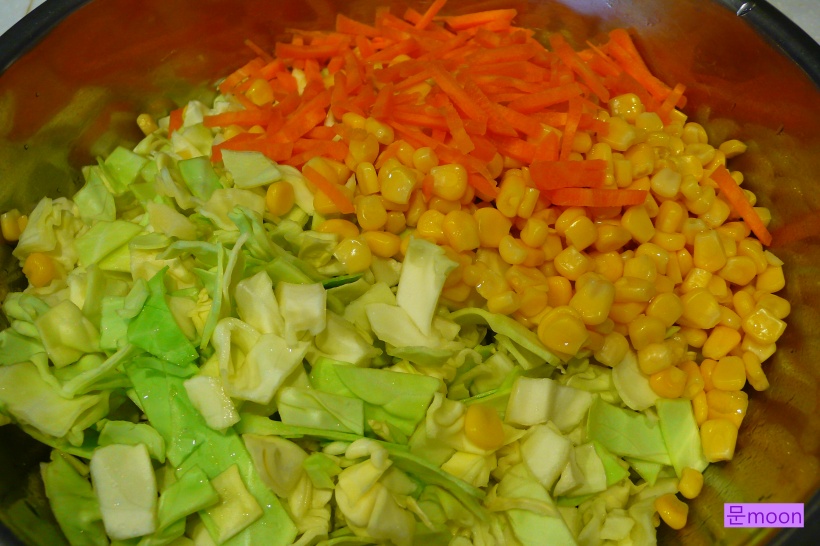 큰 스텐볼에 양배추를 담고 옥수수와 당근도 담고..