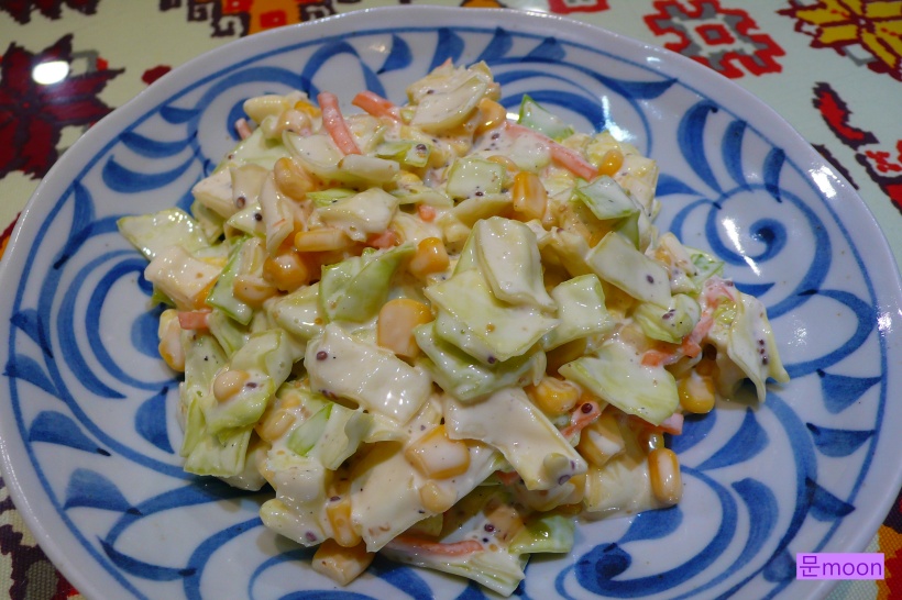 재료 : 꼬깔양배추1개(or일반양배추), 캔옥수수1캔, 당근 한토막, 마요네즈 취향껏, 홀그레인머스타드2큰술,