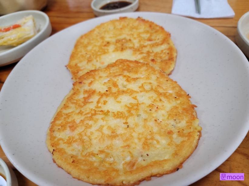 금방 부친 따끈따끈한 녹두빈대떡이 나왔습니다.