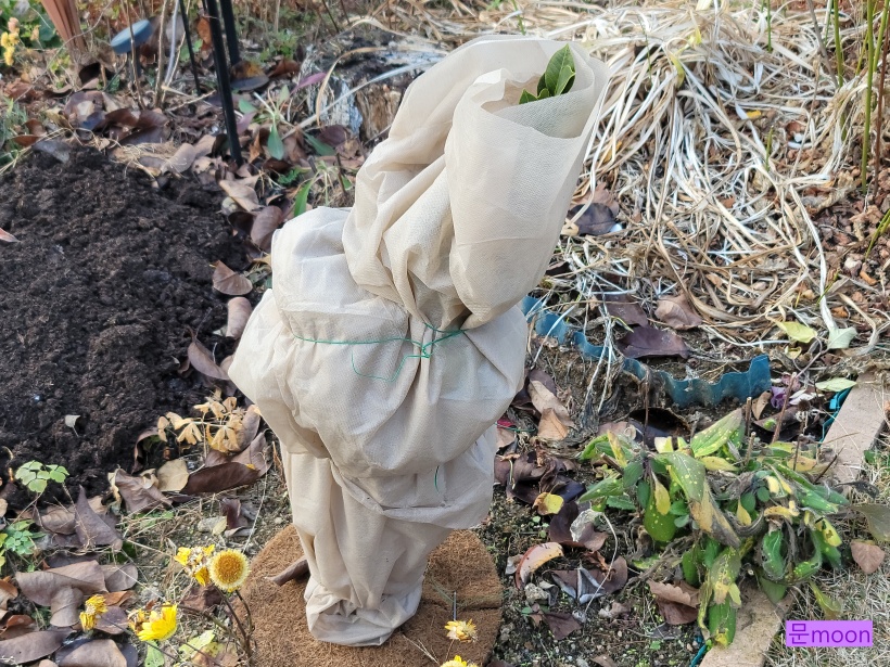 얘도 노지월동 시켜보기로.. 비닐뽁뽁이와 보온재천으로 감싸주었습니다.