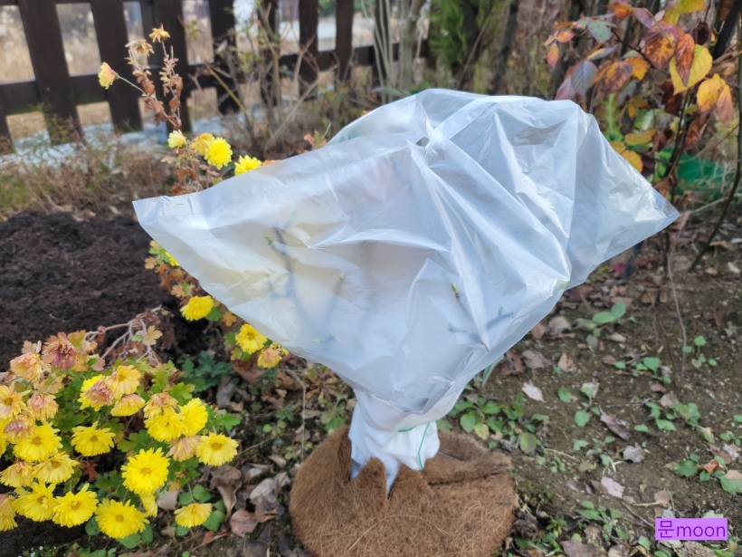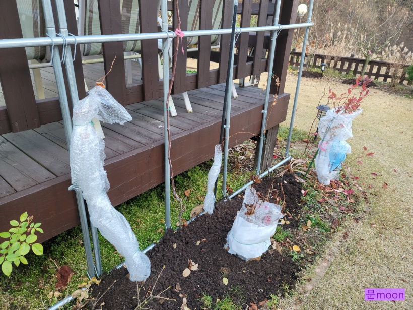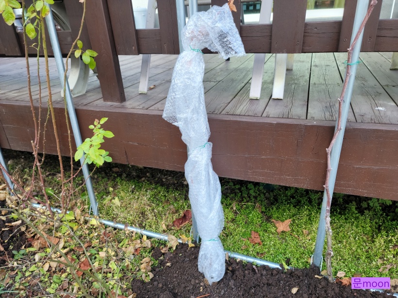 그래서 비닐뽁뽁이 보온재천 뿌리보온재로 감싸주었습니다. 내년엔 이쁜 꽃을 봐야될텐데요..