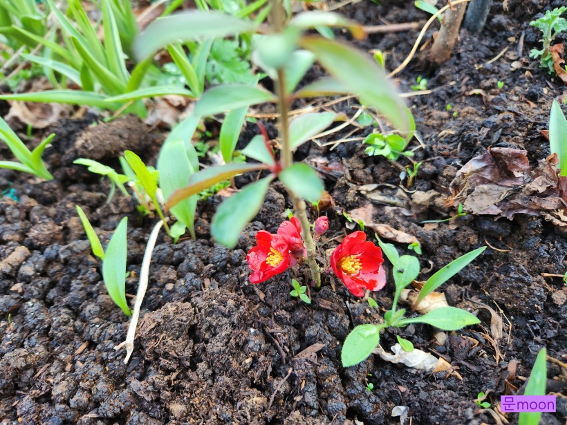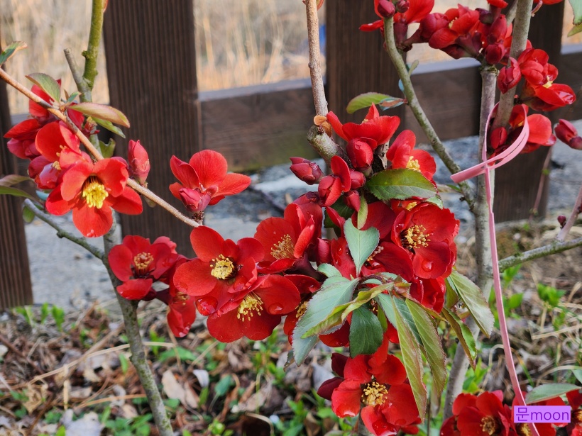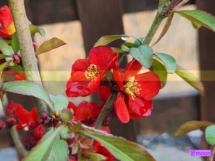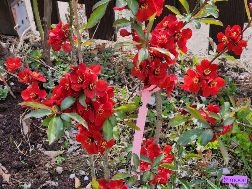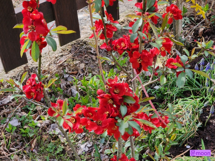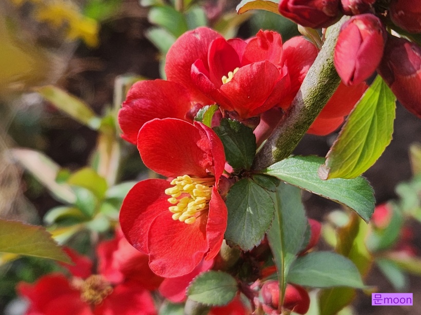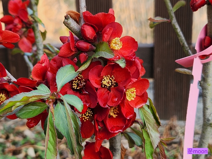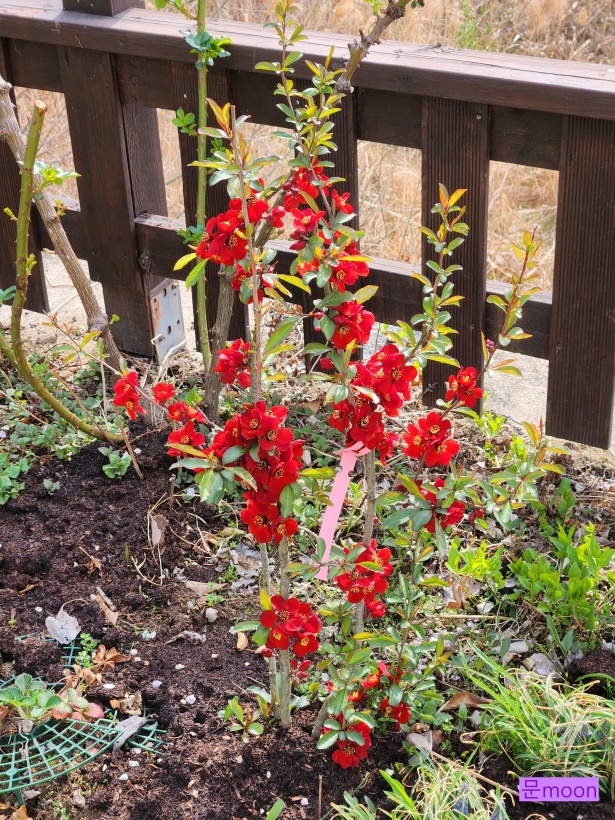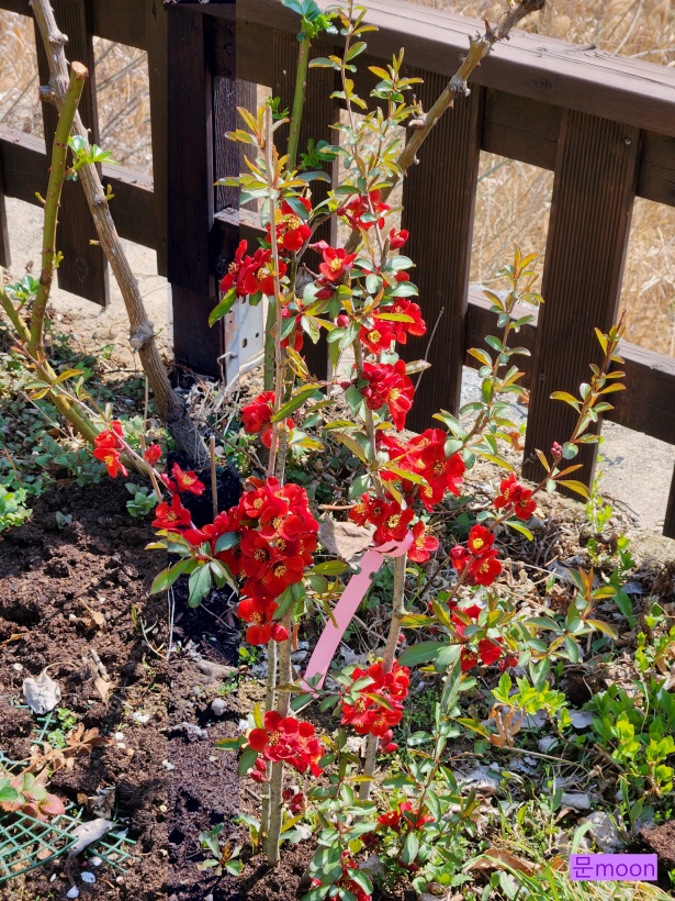 정원에 3종류의 명자나무가 있는데 산당화 라고도 불리는 명자나무는 가시가 있고 흑광과 대황금은 가시가 없습니다.