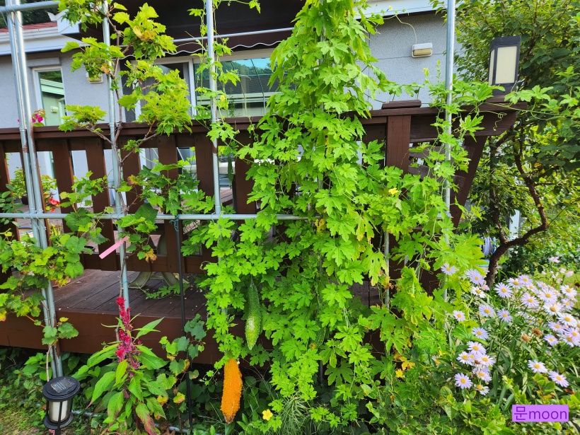 봄에 여주모종을 한포기 심어주었습니다. 덩굴성 이라 여기저기로 얼마나 뻗어나가는지..