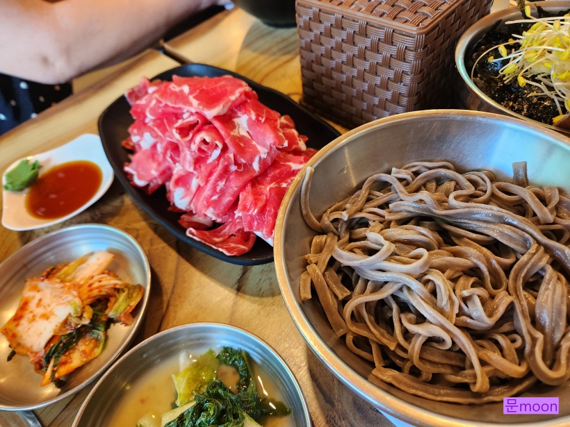 샤브샤브용 고기와 메밀칼국수 입니다.