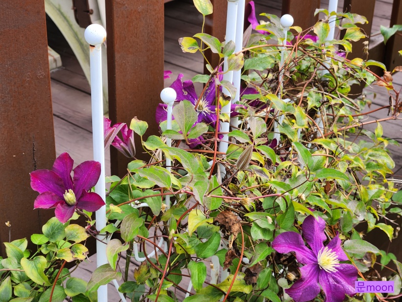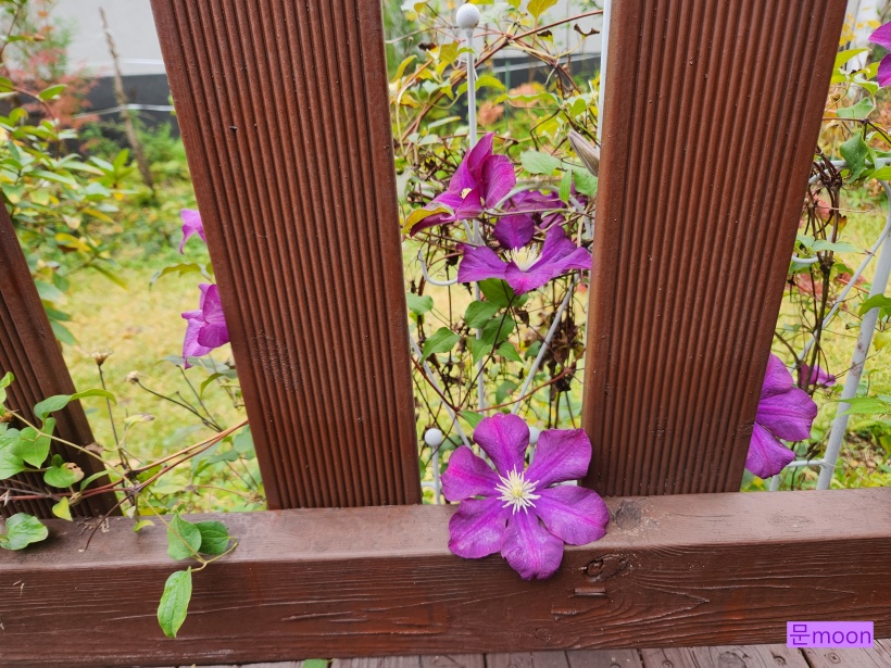 봄에 꽃피우고 가을이 되니 다시 꽃피우고있는 보라 클레마티스 와쇼니케를 담아봤습니다.