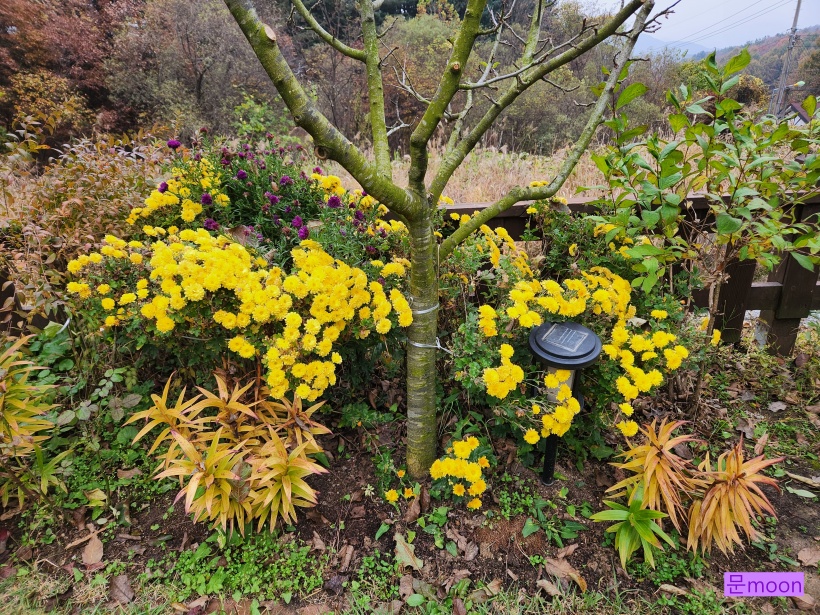 사과나무 아래 보라 아스타와 함께 피고있는 노란소국 입니다.