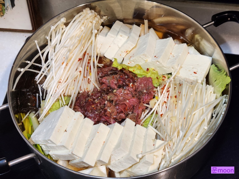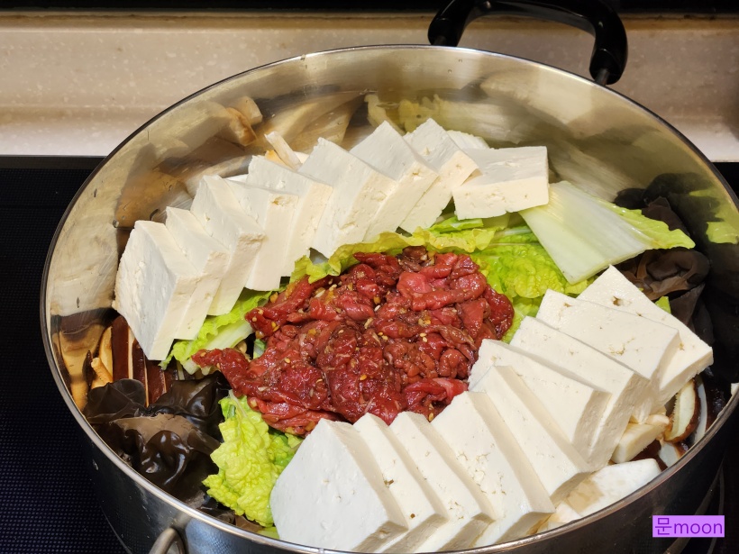 그위에 두부를 좌우로 배치해주고 쇠고기를 가운데 배치해줍니다.