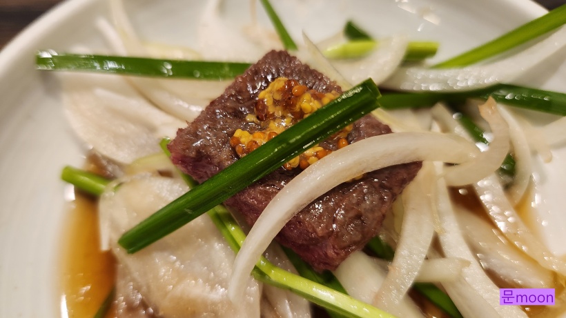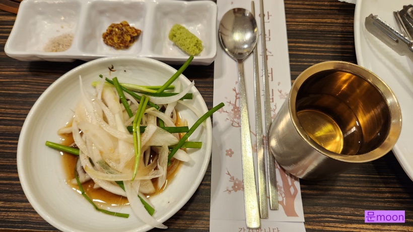 소금, 씨겨자, 와사비가 담긴 그릇과 양파절임이 나왔습니다.
