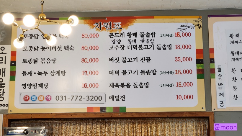 메뉴판 인데 우리는 4인 이라 고추장 더덕불고기 돌솥밥(18,000원) 4개, 메밀전(1만원)을 주문하였습니다.