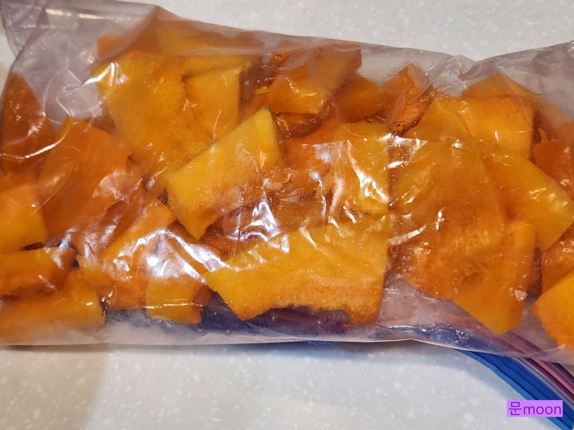 누런호박을 손질하여 일부는 냉동보관 하고 일부는 빨리 먹을거라 썰어서 냉장보관했습니다.