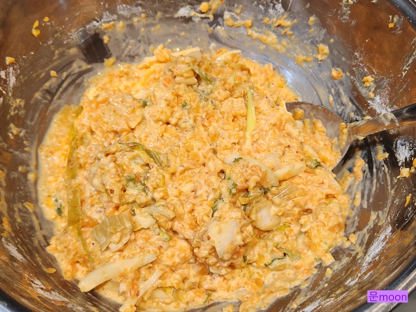 재료 : 누런호박, 김치, 양파1/2개, 부침가루2컵, 튀김가루2컵, 물, 카놀라유