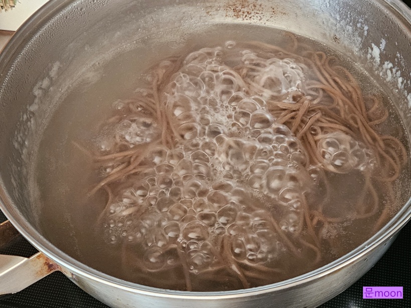 생메밀면을 5분간 삶아주고 찬물에 씻어줍니다.