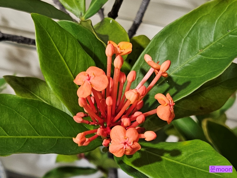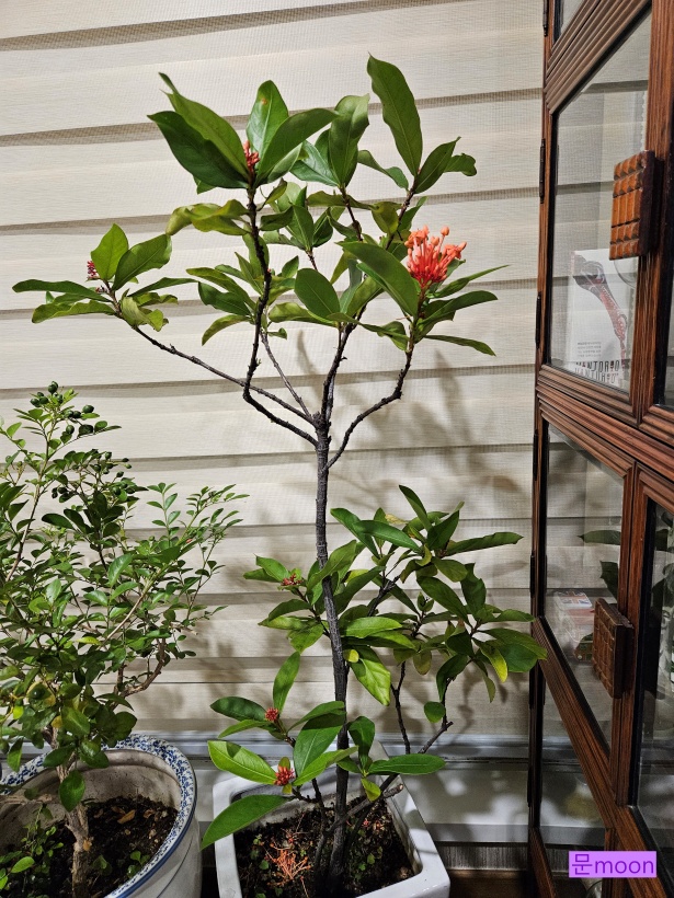 주황색 꽃볼로 꽃피우는 익소라가 아열대식물 이라 월동을 위해 들여온 실내에서 지난달에 이어