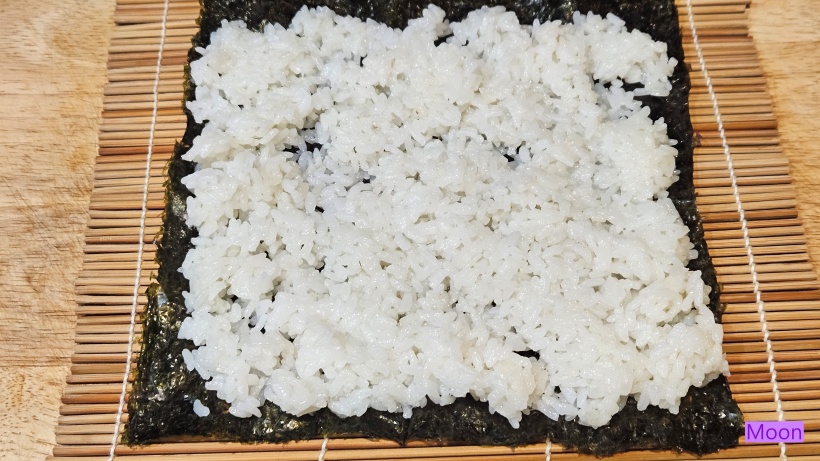 김발에 김을 깔고 밥을 잘 펴놓는다.