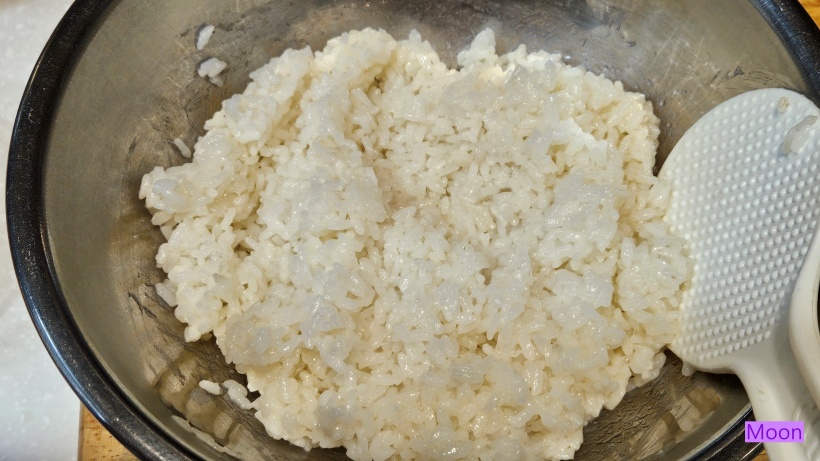 밥을 김밥2줄 할정도로 덜어 맛소금, 참기름을 넣어 잘 섞어두고 잠시 식힌다.