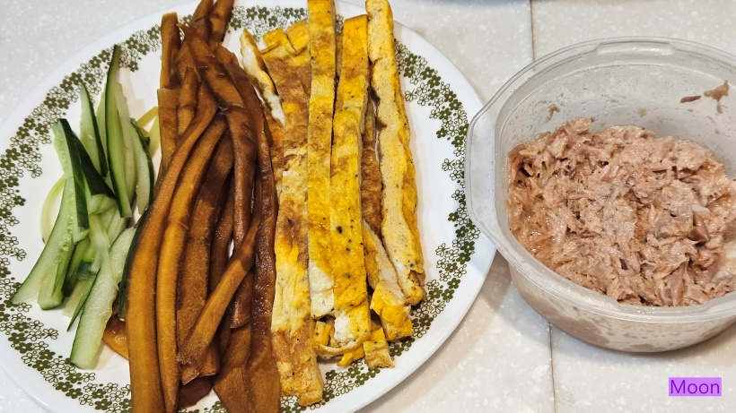 재료 : 밥1.5인분(+맛소금, 참기름), 계란3개, 태국멜론장아찌, 오이1/4개, 참치(+시저샐러드소스),깻잎4장, 참기름
