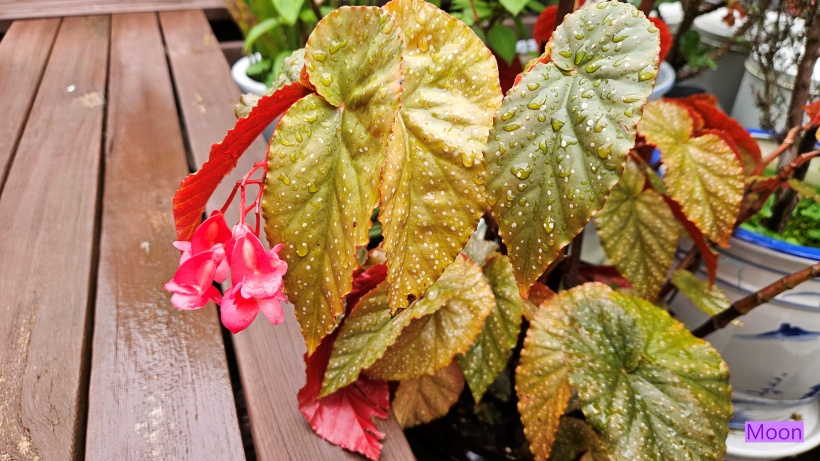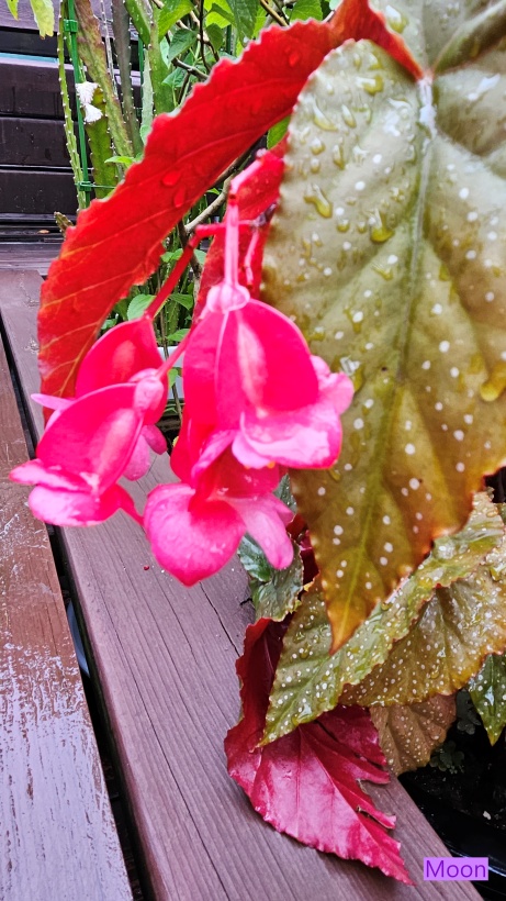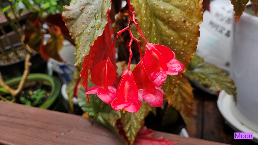 목베고니아 엔젤윙의 잎은 천사의 날개를 닮은 뒷면은 붉고 앞면은 흰 점박이 무늬가 있어 특이하고