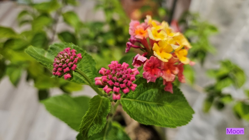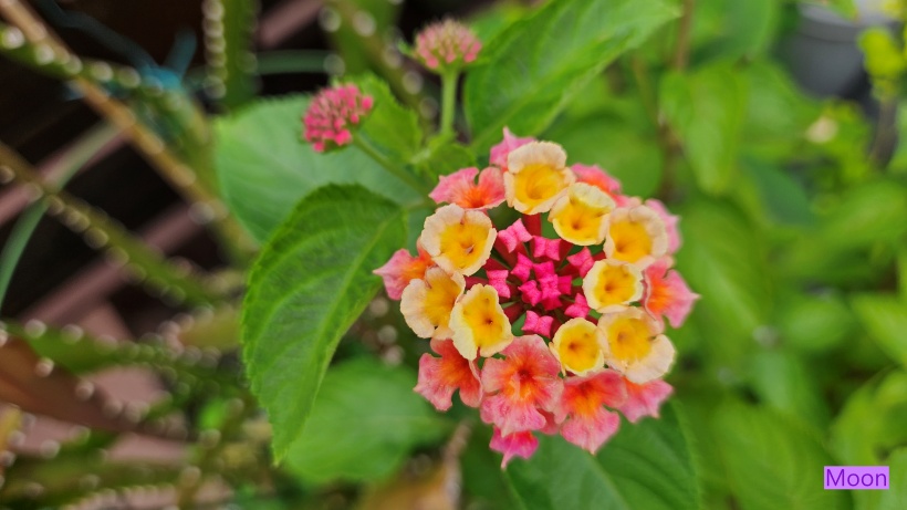 가운데 보이는 분홍 리본모양 꽃망울에서 노랗게 피어나 점차 붉게 변하는 란타나 입니다.