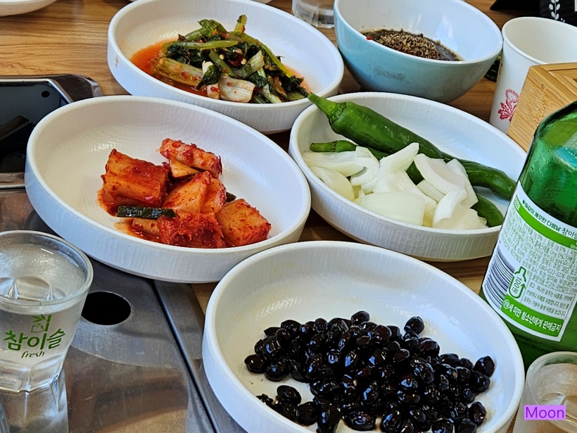 반찬은 양쪽으로 깍뚜기, 열무김치, 콩자반, 양파 풋고추가 똑같이 나왔고