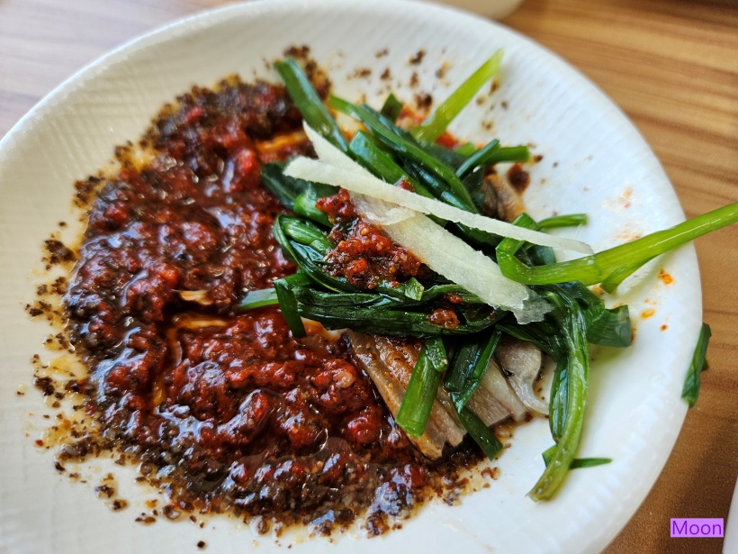 양념소스에 부추랑 수육을 찍어서 먹었습니다.