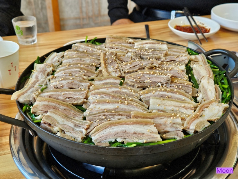 아래에 데친 부추를 깔고 흑염소 수육을 가지런히 올려놓았네요.