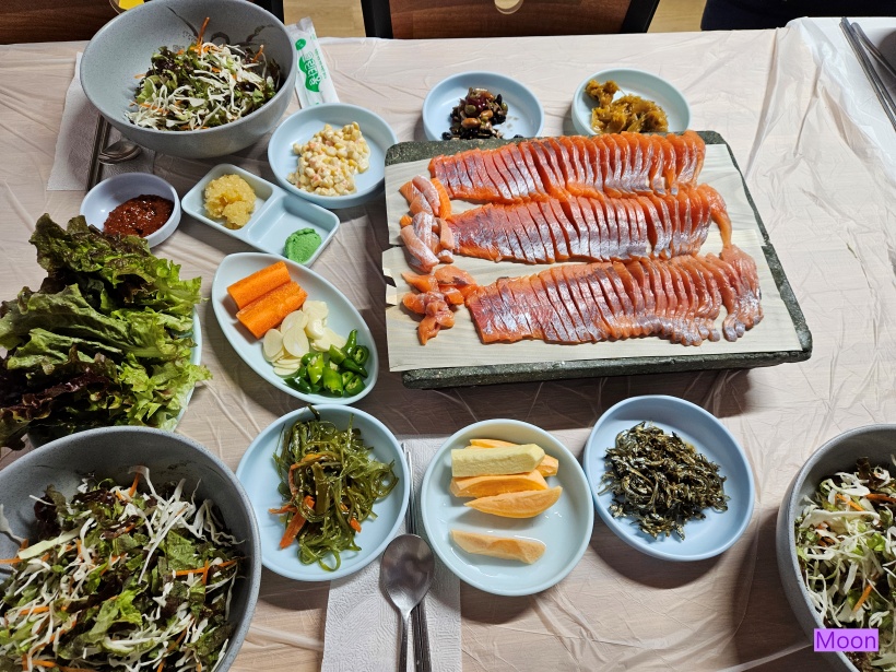 우리 일행은 7명 이어서 3인, 4인 테이블로 나눠앉았습니다.저는 3인테이블 입니다.반찬이 캔옥수수, 콩자반, 묵은지볶음, 멸치조림, 생고구마, 미역줄기볶음, 상추, 마늘 고추 당근, 쌈장, 마늘 와사비가 차려지고 개별 야채그릇이 있습니다.