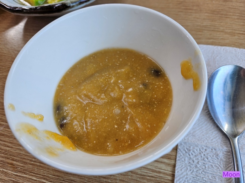 그사이에 셀프로 호박죽을 떠와서 먹습니다.