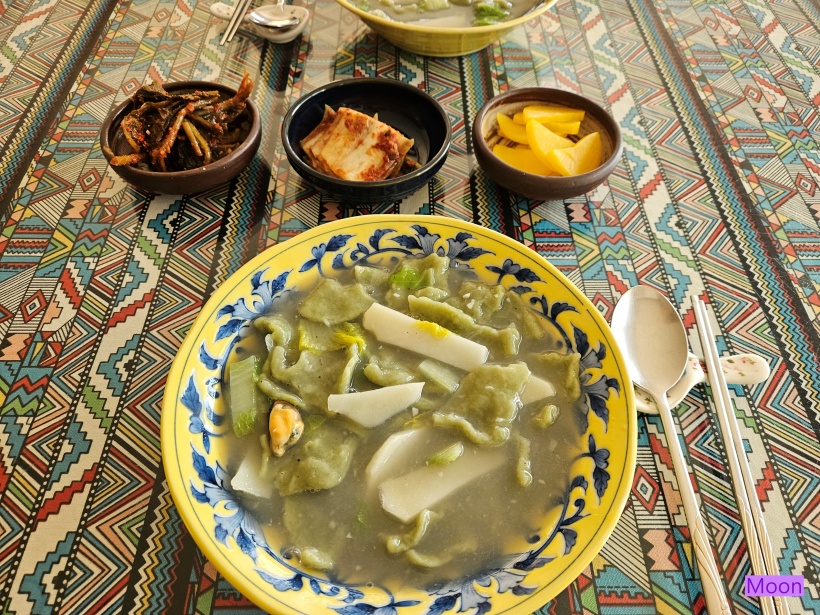 재료 : 녹차수제비반죽, 백합육수(+홍합육수, 홍합살), 감자1개, 배추잎4장, 소금1작은술, 후추