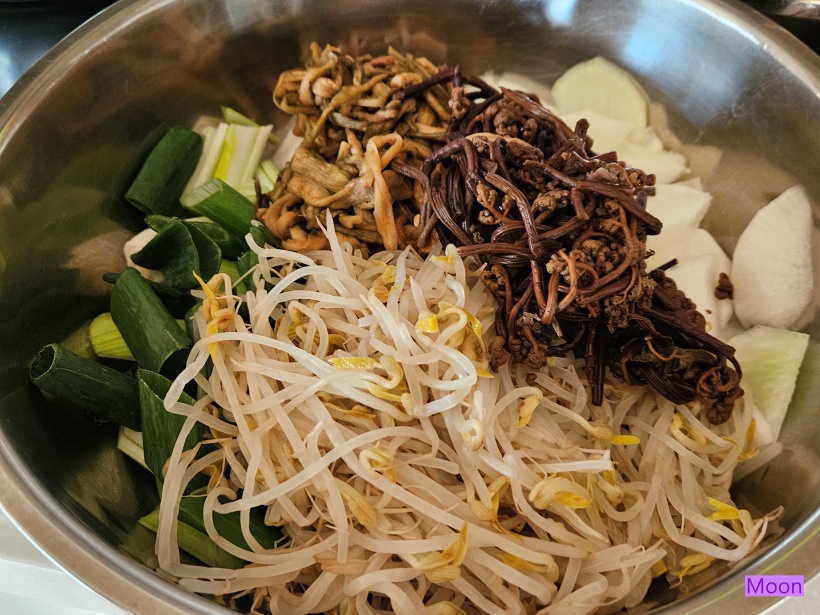 말린 토란대는 끓는물을 부어 불어나면 씻어서 넣고 고사리는 20분간 삶아 씻어넣습니다.