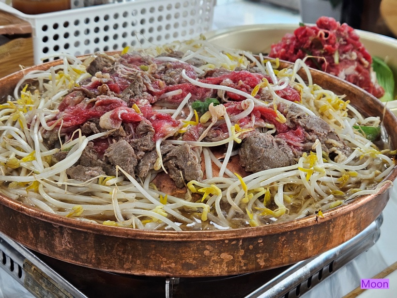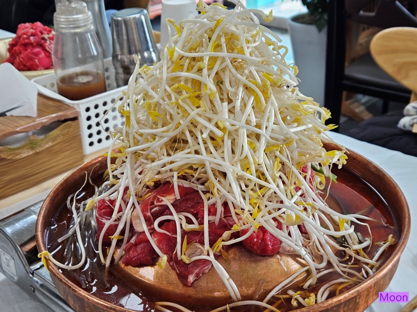 불고기 불판에 불고기와 숙주가 산더미로 쌓여있네요.