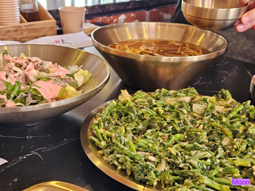 샐러드, 묵사발, 미나리전, 돈까스가 2인에 한접시, 콩나물, 무생채가 나왔습니다.