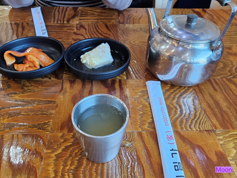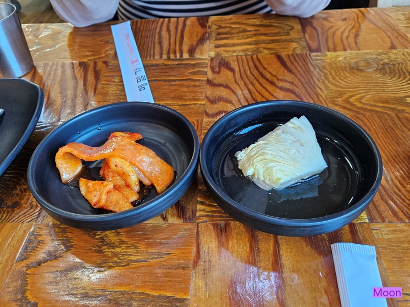 따뜻한 육수주전자와 무김치, 백김치가 나왔습니다.