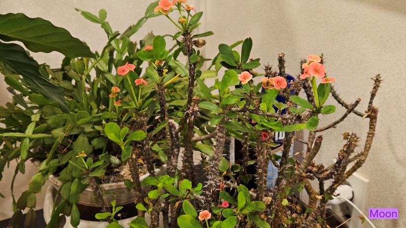 오래 키운 묵은둥이 꽃기린이 실내월동 중에도 꾸준히 꽃을 피워주고 있습니다.
