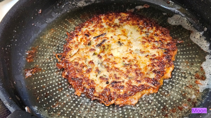 후라이팬에 식용유, 들기름을 두르고 한국자씩 떠서 부쳐줍니다.